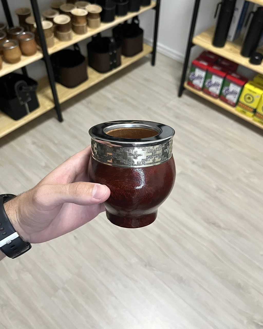 Mate de algarrobo laqueado con fleje de alpaca y virola de acero inoxidable.