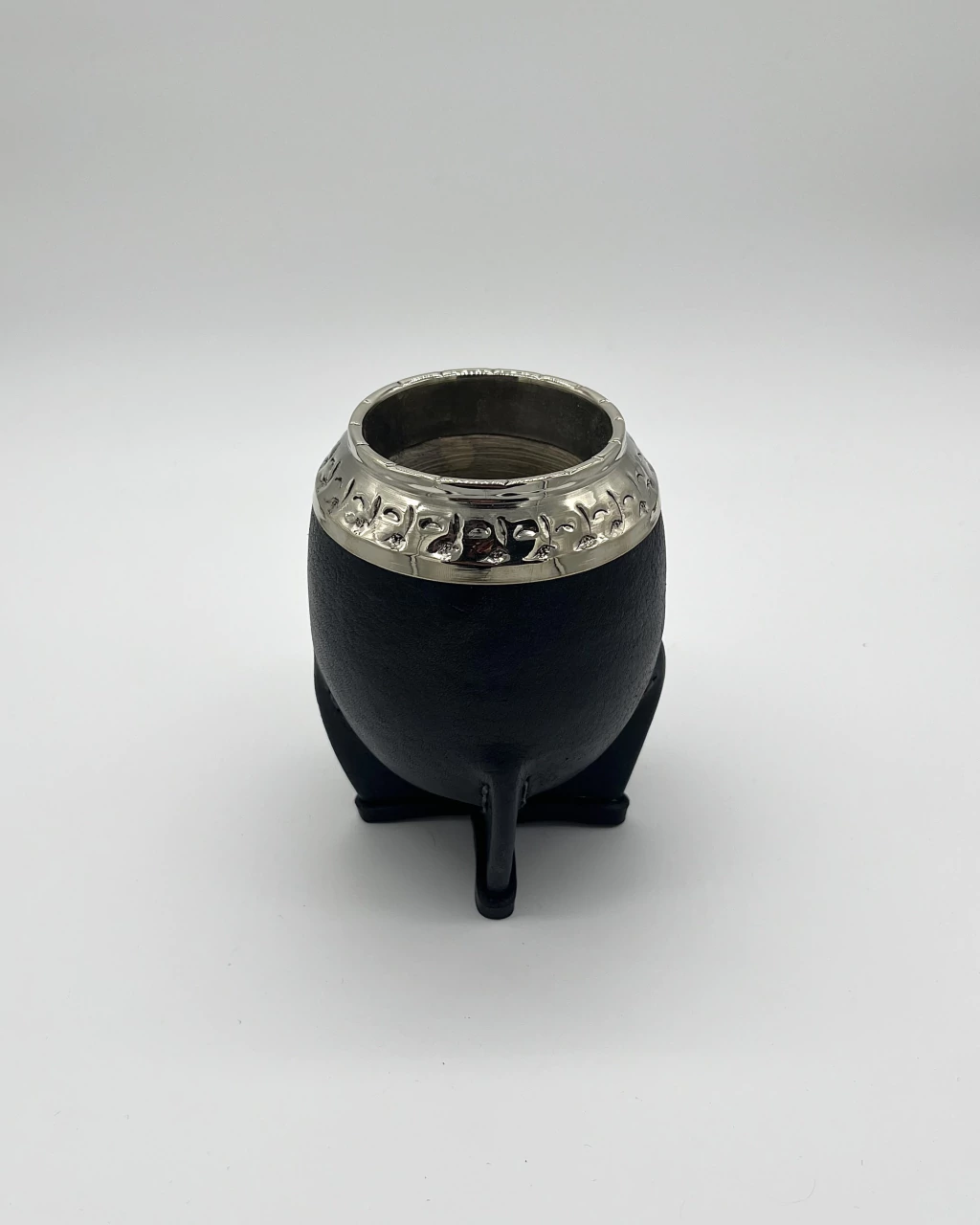 Mate torpedo con virola de alpaca cincelada + Bombilla pico loro + Termo media manija negro.